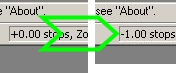 7) Hit the - [minus] key to drop the f-stop parameter down 1. If you look at the bottom right of the screen, the "+0.00 stops" is now showing "-1.00 stops." Understanding at this point is not necessary. Just know that this reduces the luminance of the current image in HDRShop. |
