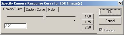 2) Load this file into HDRShop and take the default Camera Response Curve. The Camera Response Curve isn't really important as we will be making changes to our own images instead of compiling others, so the default is usually OK for what we are doing. |