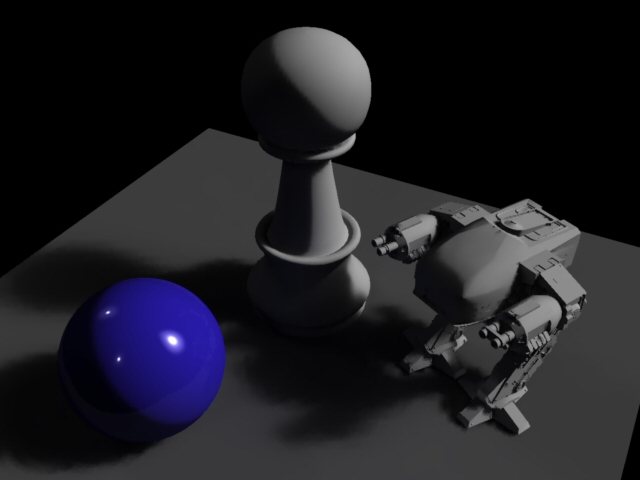 Understand that as a whole, the numbers are a reflection of the environment so they will vary widely over the image, but your light sources should have a relatively high value of no less than 32. In doing so, you may also want to make sure that large light areas not exceed the value of 1024. This will cause burning, or large overly-white hot spots, in the render. The key is to be subtle and reproduce realistic lighting. While in some cases you may want the burning associated with a bright light, in natural lighting you want to keep the values at lower levels. Pure White (H=255, S=255, L=255, 100% opacity) at lower f-stops will produce higher values in a doubling value. 1 at +0, 2 at -1, 4 at -2, 8 at -3, and so on. One word of warning, NEVER add black, or for that matter anything with a HSL-luminance value less than 32 (Paul Debevec recommends 15, but I like to be careful). Adding colors of this range will create artifacting in the image which translates into serious color banding when you change the f-stops parameters. Trust me on this one, just don't do it. Rendertime: |