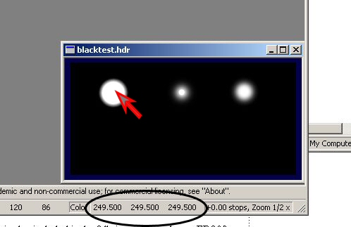 If you put your mouse cursor over the light areas you will see that the numbers in the lower right corner will change according to the luminance of the area. These number are independent of the f-stop number and will remain the same no matter what stop you have it at. The minimum this number has to be to create a decent light source is 32. | |