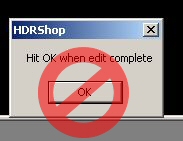 3) Click "File", then "Edit in Image Editor". Wait a few seconds. When HDRShop prompts with a window that says "Hit OK when edit complete," switch over to the image editing program. DO NOT CLICK OK! This will return the image from the temp file and your subsequent edits will not come through. Trust me, just leave it alone for now. |